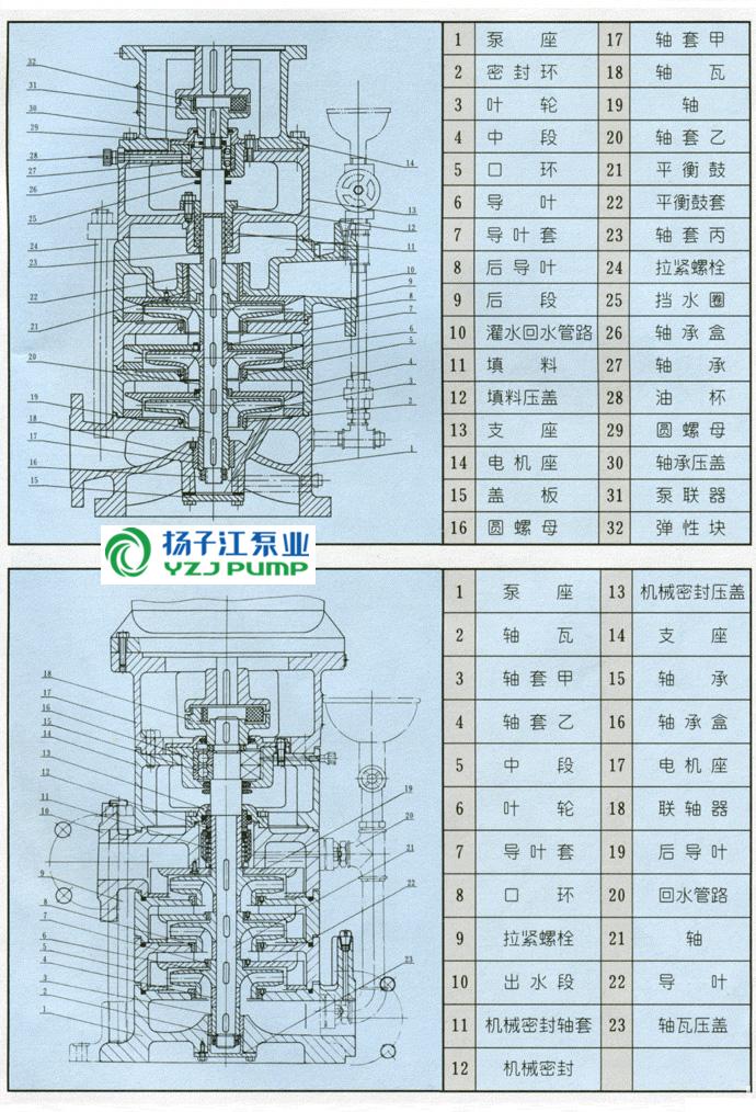 LG型泵的主要零件有:泵座、中段、后段、葉輪、導葉套、導葉、后導葉、支座、電機座、軸、軸承、軸套、密封環、平衡鼓、平衡鼓套等。(25LG、32LG、40LG三種泵沒有平衡鼓和平衡鼓套,而設有水封環.裝在填料腔的底部。