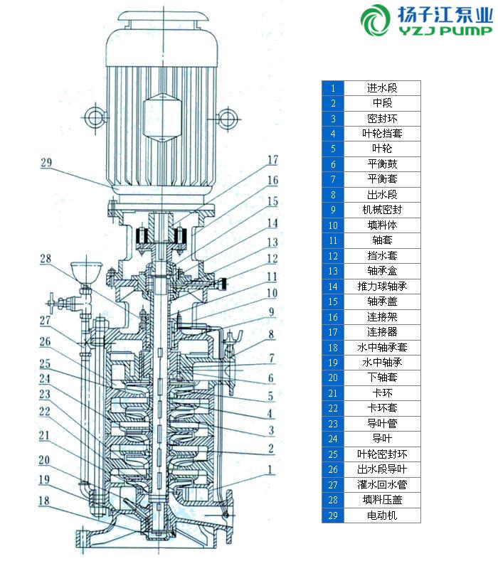 DL型泵由電機和泵兩部分組成,電機為丫型三相導步電機,泵和電機采用聯軸器連接.整體為剛性連接,使用吋無需校正泵由定子部分利轉子部分組成泵定子部分由進水段.中段.導葉.出水段、填料函體等零件組成為防止定子磨損,定子上裝有密封環.平衡等,磨損后可用備件更換轉子部分由軸.中輪,平衡鼓等組成轉子下端為水潤滑軸承.上部為角接觸球軸承.泵的軸向力絕大部分由平衡鼓來承擔,其余小部分殘余軸向力由角接觸球軸承來承受逬水段、中段和出水跺的結臺面用紙墊通過拉緊達到密封.軸封采用填料或機械密封.用戶可根據需要選擇。