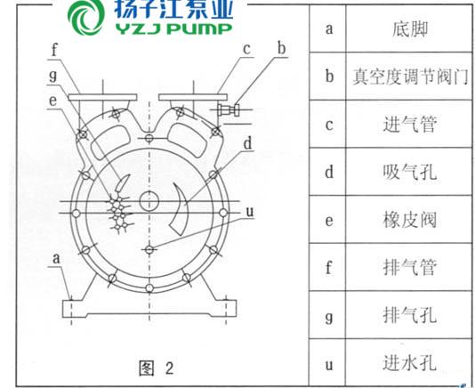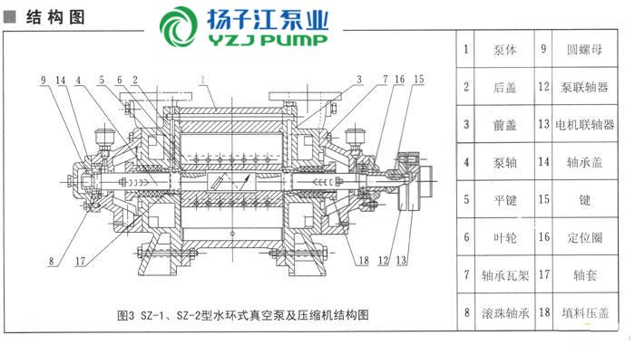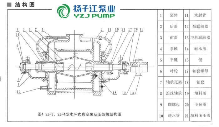SZ-1及SZ-2的結構如(圖3)所示,其與SZ-3及SZ-4結構(圖4)不同之處是:進、排氣管分別在兩個側蓋上,一根管與進氣口相通,一根管與排氣口相通,泵內無橡皮閥。