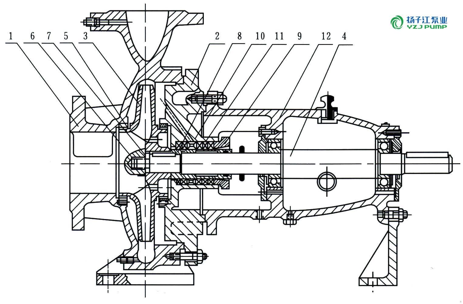 1 泵體 2 泵蓋 3 葉輪 4 軸 5 密封環(huán) 6 葉輪螺母 7 止動(dòng)墊圈 8 軸套 9 填料壓蓋 10 填料環(huán) 11 填料 12 懸架軸承部件