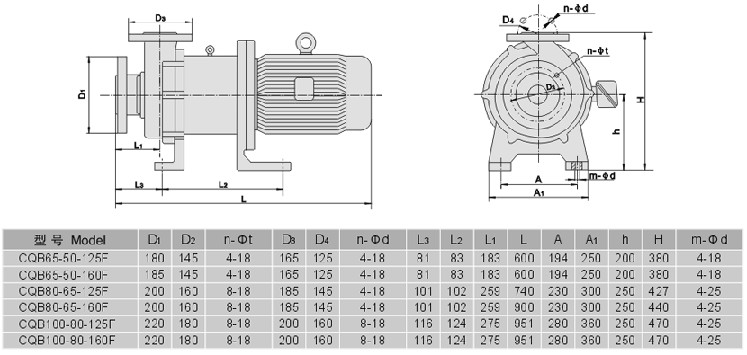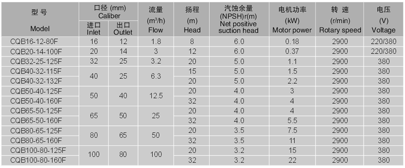 CQB-F系列全氟襯氟磁力泵性能參數(shù)型號(hào)意義安裝尺寸