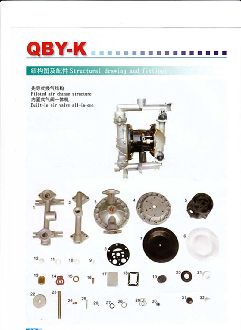 QBK型氣動隔膜泵目前成規(guī)模生產(chǎn)的有鑄鐵,鋁合金,不銹鋼,工程塑料,流體襯氟,流體襯膠六個品種,用戶可根據(jù)輸送介質(zhì)特性進行選擇,