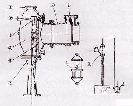 水力噴射器由器體、器蓋、噴咀、噴咀座板、導向盤、擴壓管及單向閥等部件組成,噴咀用不銹鋼制造,噴咀座板由優質鋼加工,其余零件則系鑄鐵鑄造。噴咀采用多噴咀的結構形式,以便得到較大的水—汽接觸,有利于熱交換的進行,獲得較好的真空效果。噴咀座板加工精密,精度較高,以使噴射水流準確地聚集在同一的焦點。導向盤用于減慢蒸汽(或空氣)的流速,使蒸汽均勻地導入器室以免噴射水流偏斜,降低抽射效能。整個裝置結構緊湊精密,強度高,用于真空蒸發系統中,由于能把冷凝器的冷凝作用與真空泵的抽氣作用合并在一個設備中同時完成,大大地簡化了工藝流程,比之原來真空泵加舊式冷凝器的裝置,可以節省去真空泵、冷凝器、分水器等設備,并且還有下列優點: