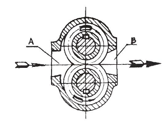 嚙合的齒輪在泵體內旋轉時,輪齒不斷進入和退出跟嚙合。在吸入室,輪齒逐漸退出嚙合狀態,這樣吸入室的容積逐漸增大,壓力降低,液體在液面壓力的作用下進入吸入室,隨齒輪齒間進入排出室。在排出室,輪齒又逐漸進入嚙合狀態,齒輪的齒間逐漸被一齒輪的輪齒占據,排出室的容積減少,排出室內液體壓力升高,于是液體從泵的排出口被排出泵外,齒輪邊續旋轉,上述過程不斷進行,形成連續的輸油過程。其原理圖見圖一。(在電機后端看,箭頭所示為泵的出口)