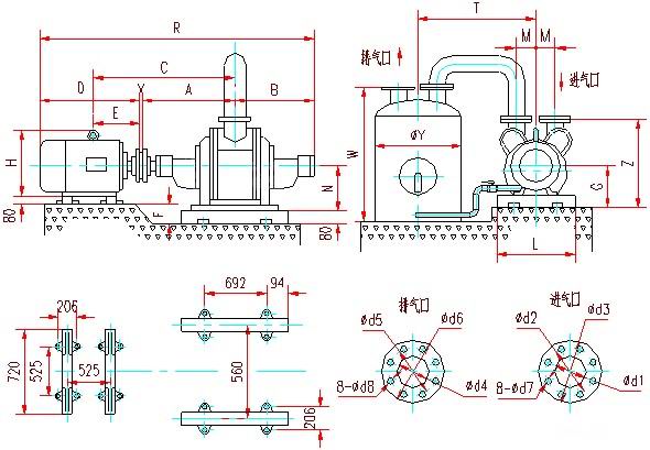 | 代號(hào) | R | Z | d1 | d2 | d3 | d4 | d5 | d6 | d7 | d8 | F | E | 地腳螺栓 |